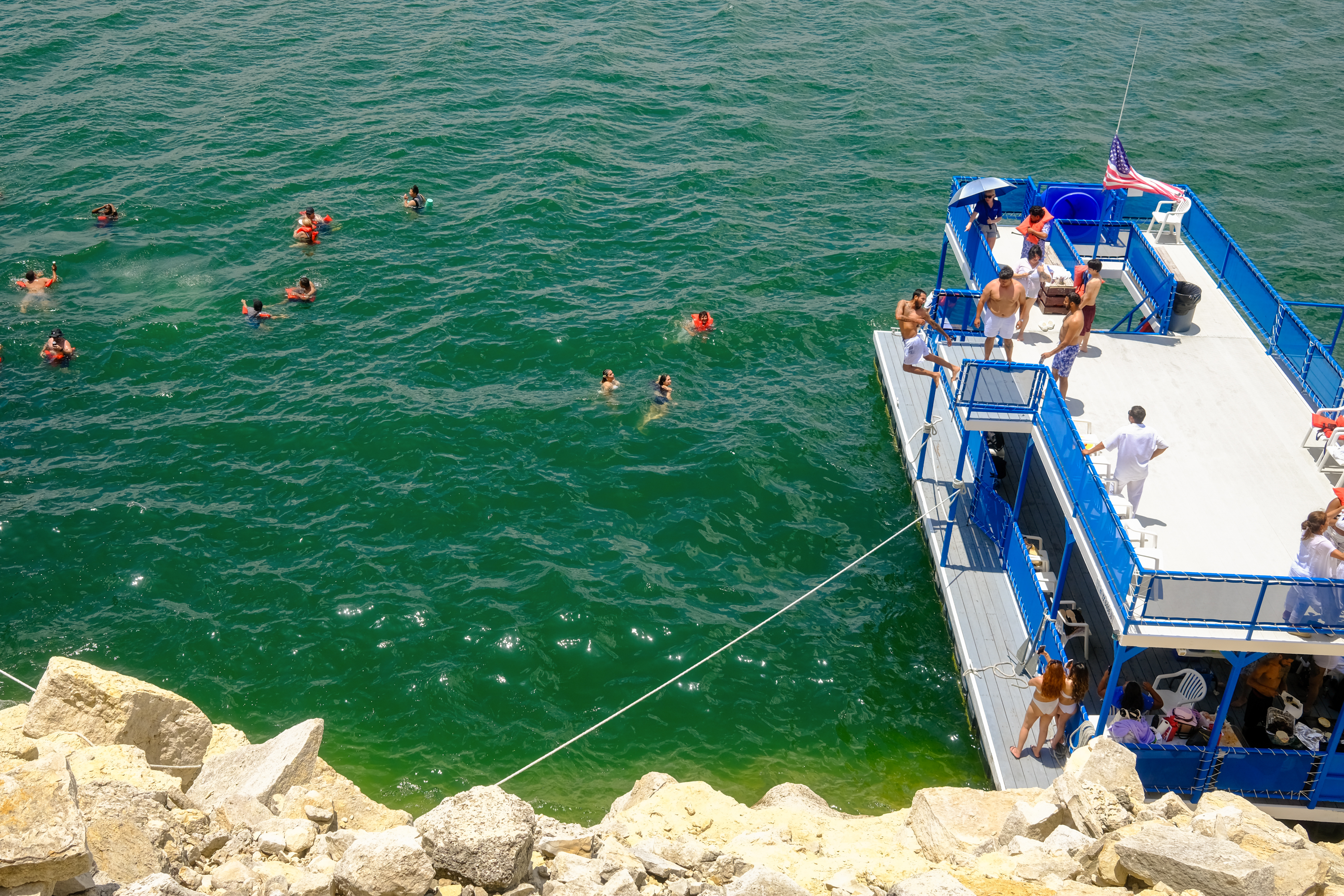 I finally got the chance to use it as two of the interns were hosting a Barge, which is a type of event where you rent a party boat. I learned that it's a pretty popular Austin activity, especially for student orgs at UT Austin. The boat, which held over 100 interns, cruised along Lake Travis and stopped at a small island where my friends and I climbed up on the rocks! The boat also had a small dock and a tube slide, so between exploring the island and taking photos, we cooled off by jumping into the lake.